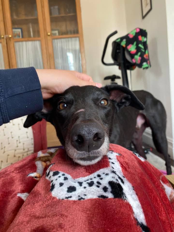 We are heartbroken that we have today lost this beautiful, black, greyhound boy. Initially diagnosed as a possible old racing injury, it became clear our fears that he was getting more lame, rather than better, were founded when we took him back to the vets and he corroborated that Sooty sadly had osteosarcoma in his front leg and we had to say a final goodbye to our darling boy.